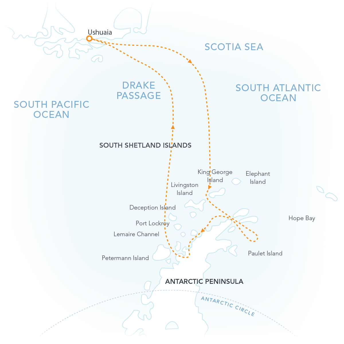 One of the most exhilarating and humbling parts of an Antarctic expedition is that each one is unique! Once we set sail for the Antarctic Peninsula, the exact route and landing sites are guided by weather, wildlife, and ever-changing ice conditions. This map highlights a few of the destinations often visited on expeditions like ours, offering a glimpse of what may be possible along the way. In Antarctica, we let Mother Nature lead the adventure, and flexibility is part of the magic!
